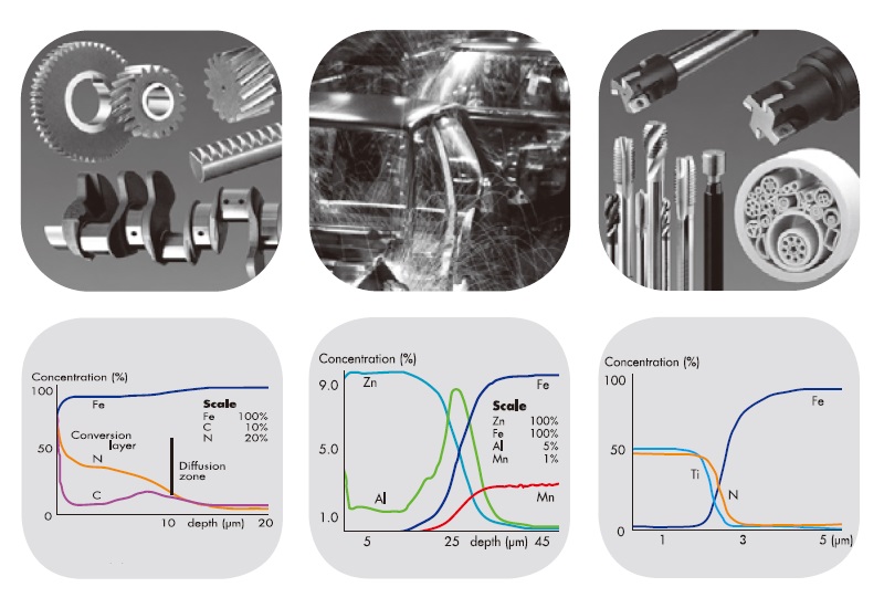 熱處理工藝中,如表面滲碳硬化或滲碳熱處理等,都可以通過分析被處理材料的表面和近表層區域,準確測量所關心元素的含量-深度分布,定性、定量檢測表面污染物、夾雜物和物相比例。