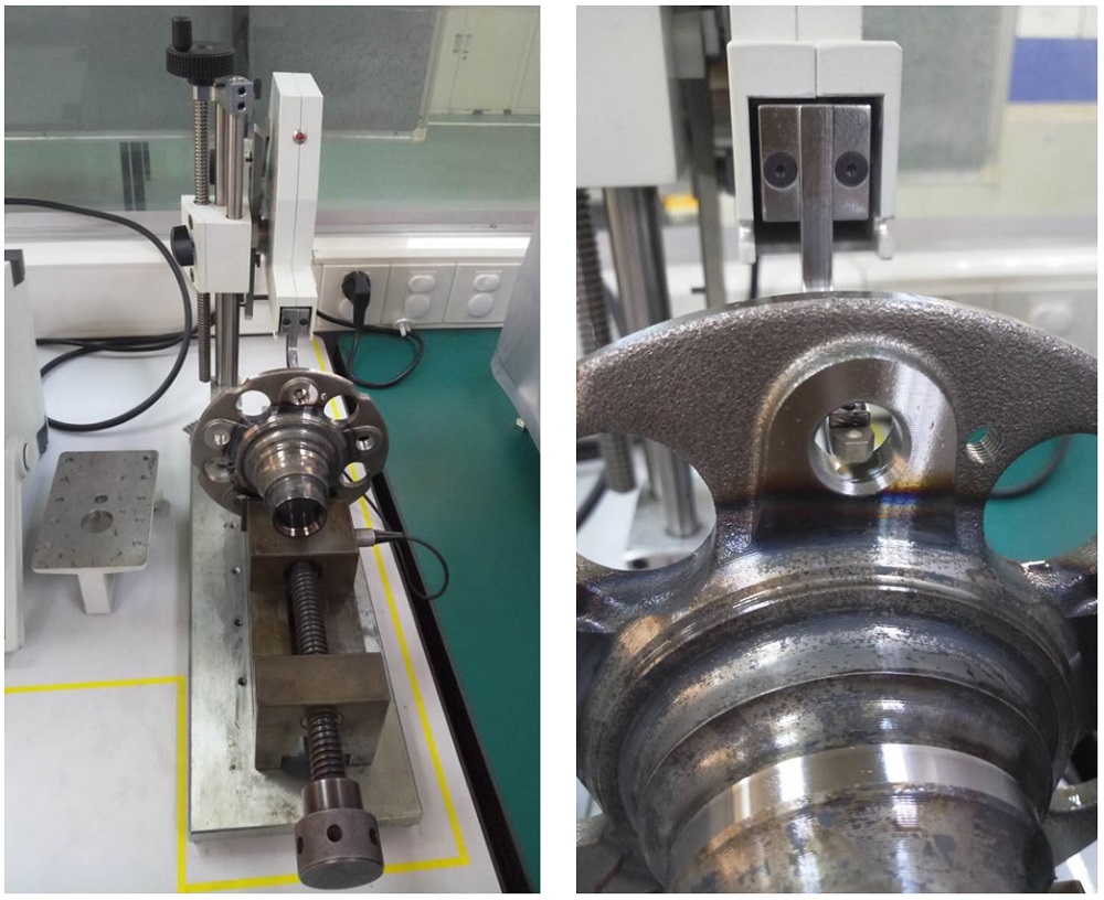 汽車上的軸承多種多樣,對(duì)各個(gè)部件的要求的也都十分嚴(yán)格。因?yàn)槟骋粋€(gè)部件一點(diǎn)小的性能差別都可能造成可靠隱患。 汽車軸承上的一些固定的用的螺栓孔也是非常重要的,不僅要求孔的尺寸和定位精度,同時(shí)對(duì)加工時(shí)的質(zhì)量也有很高的要求。要求孔在加工的過(guò)程中不能產(chǎn)生加工硬化,以免對(duì)整個(gè)零件的長(zhǎng)期穩(wěn)定性產(chǎn)生影響。那么檢查是否有加工硬化產(chǎn)生又能不破壞零件,好的辦法就是采用小載荷的維氏硬度檢測(cè)。但是由于孔洞的尺寸一般只有十幾個(gè)毫米,想要進(jìn)行維氏硬度測(cè)試是很難實(shí)現(xiàn)的。 恩斯特的MTR硬度計(jì)就能很好的解決孔洞內(nèi)側(cè)硬度測(cè)試的難題。