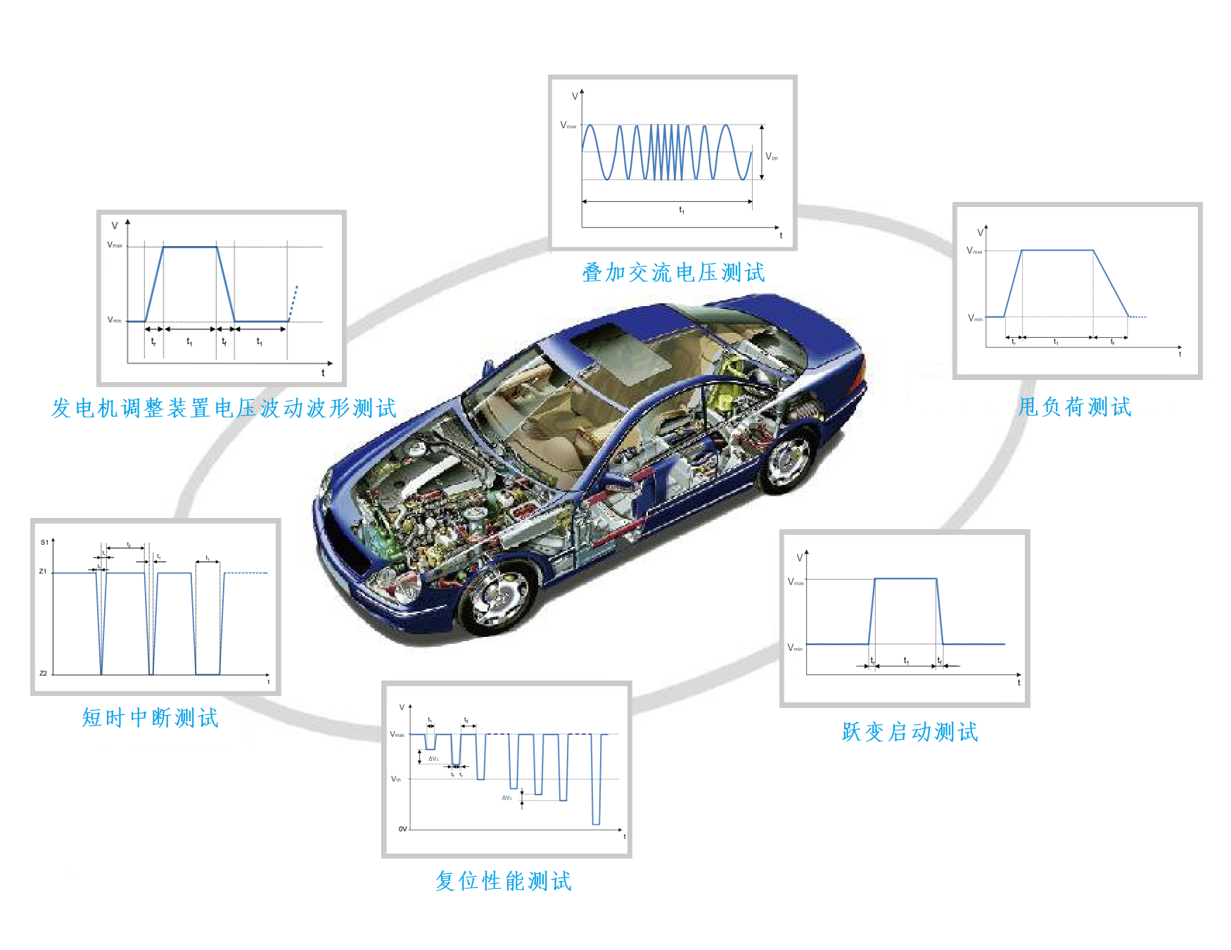 本測試系統(tǒng)可為各汽車公司制定的電性能測試標準要求提供靈活的解決方案,應用于檢測汽車零部件的功能檢驗和可靠性能檢驗,可滿足GMW 3172、VW 80000、LV 124等汽車企業(yè)標準的測試要求。
